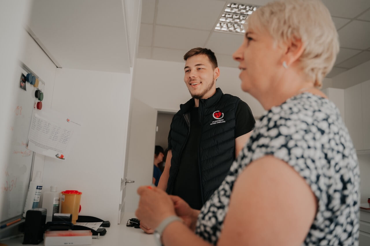 Unsere Pflegedienstleitung vereinbart mit Ihnen einen Termin zum Aufnahme- und/oder Beratungsgespräch. In diesem ersten Informationsgespräch wird Ihr persönlicher Pflegebedarf ermittelt und die benötigte Hilfe besprochen. Sie können in diesem Gespräch all Ihre Fragen loswerden.